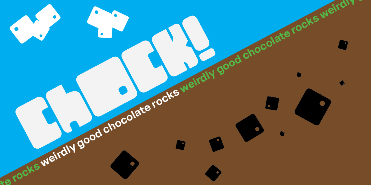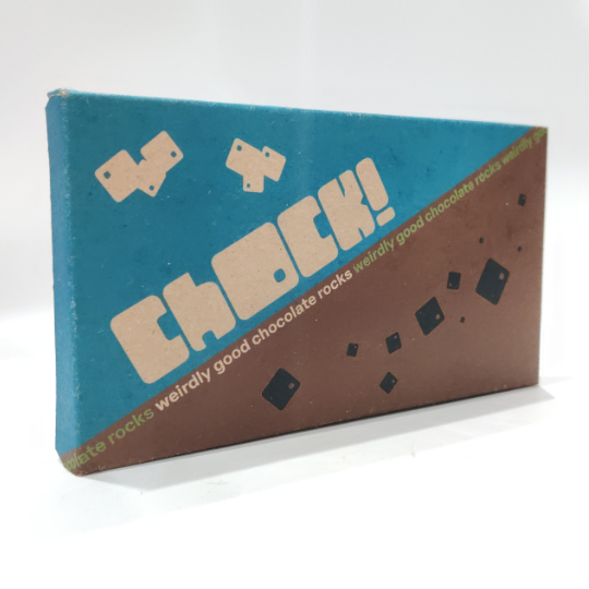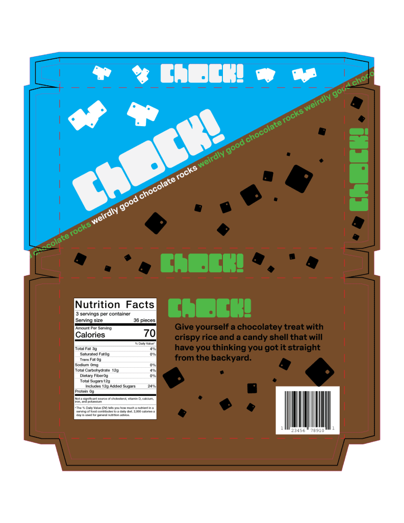 I had the idea to have a nature theme for my box, and as it turned out we also had a pretty big supply of craft paper in the print lab, which gave the impression that the box was made of recycled paper. I decided to use the natural brown color of the paper to represent soil, and made a design around that look. I was able to use a variable typeface to give each letter a different width, and duplicated the ‘O’ to represent the rocks in the ground and clouds in the sky. I was also able to repeat the “weirdly good chocolate rocks” tagline to represent the grass.
