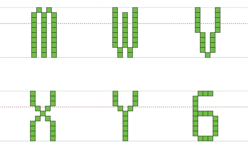 I wasn’t able to fully conform to my 4 x 10 grid, sometimes extending it to 5 x 10 for M, W, V, X, Y, and 6. At 4 x 10, M, W, and V were illegible, and X and Y were difficult to look at. The 6 required a more rounded bottom to help more easily distinguish it from the 8.