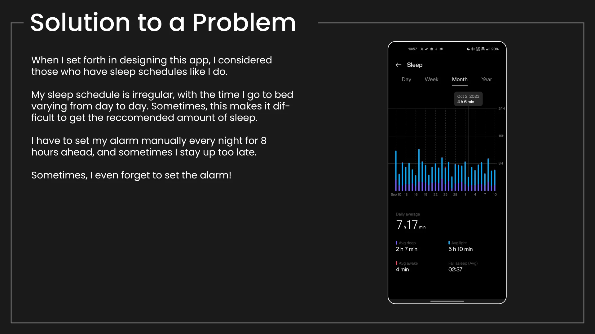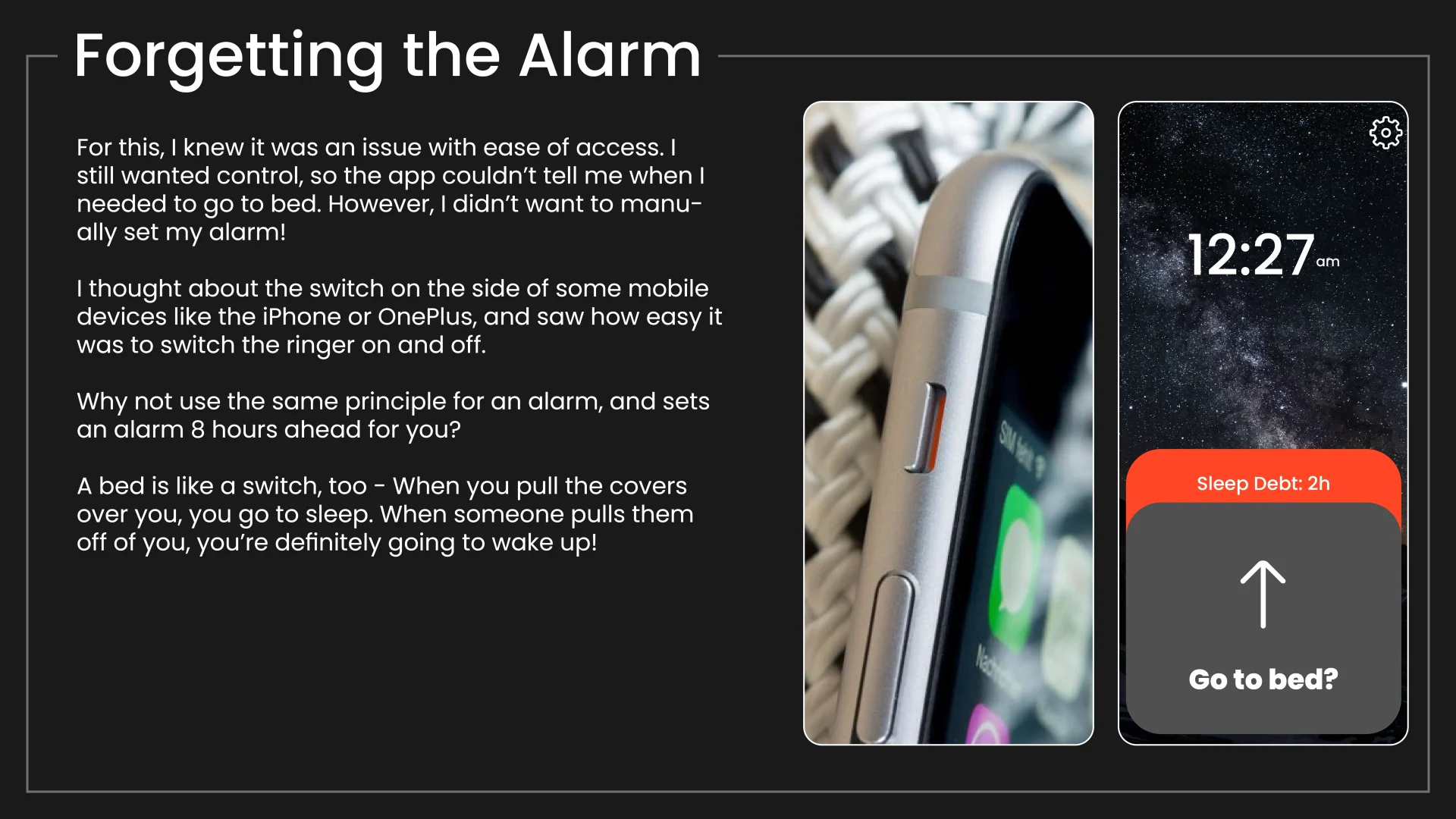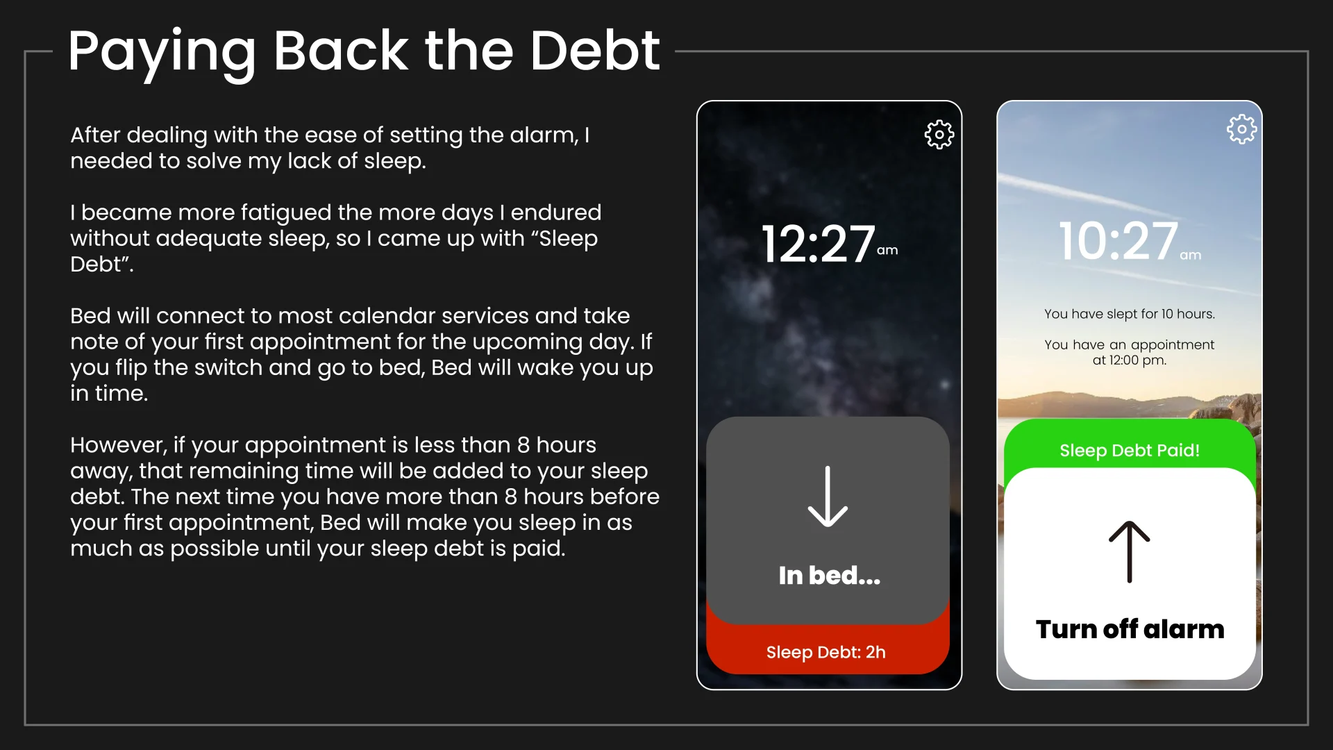 Bed is an imaginary alarm app for those who have irregular bedtimes like myself. When you flip the switch, the app sets your alarm for 8 hours in the future. If anything in your calendar conflicts with that, then the app will wake you up earlier with enough time to get ready, and add any remaining time to the sleep debt counter. When you have extra time to sleep, then the app will wait to wake you up until it replenishes as much of your sleep debt as it can. Hopefully, this way, someone can hope to get at least 8 hours of sleep on average, and be able to check how much sleep deprivation they are subjecting themselves to.