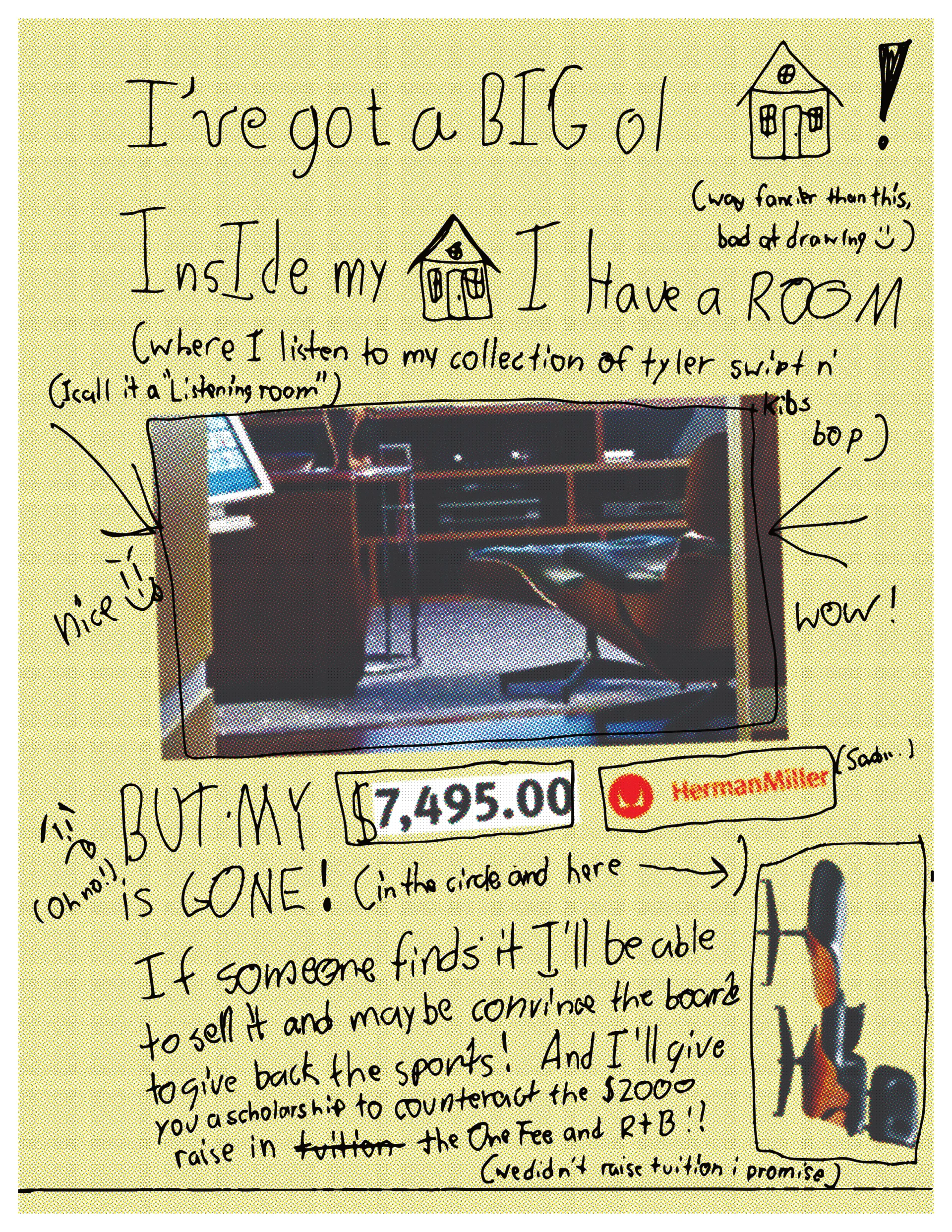 “SPECIAL ISSUE” was a letter size sheet of paper folded in half and included in every physical copy of Double Take, finished just hours after the announcement. It reflected my frustration on that day, with the sports cuts and rising tuition making me feel like the student body was being exploited. It focused on showing the dissonance between the luxury contained in the president’s mansion (which had been the target of vandalism that night) and the University’s apparent need for money in an absurd way. I thought it fit well within the context of my zine, and within the broader history of zines as a medium for protest.