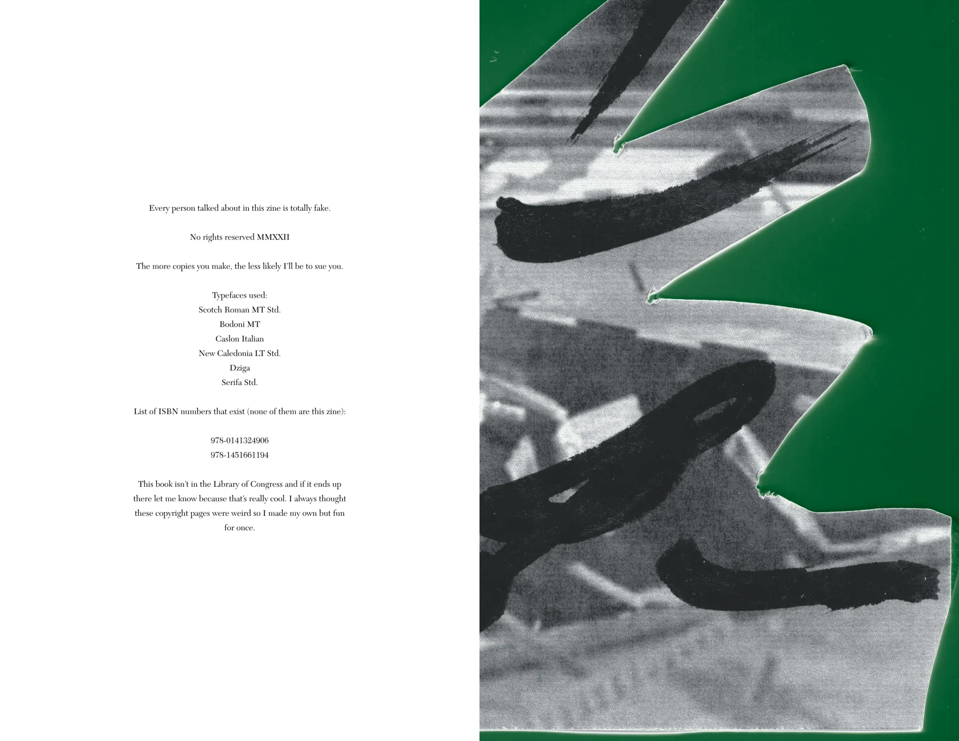 The cover was adorned with handwritten variations of “WITH SPECIAL ISSUE”, and the last page before the rear cover contained handwritten citations for my images, as well as a small illustration and serial number to make each copy unique.