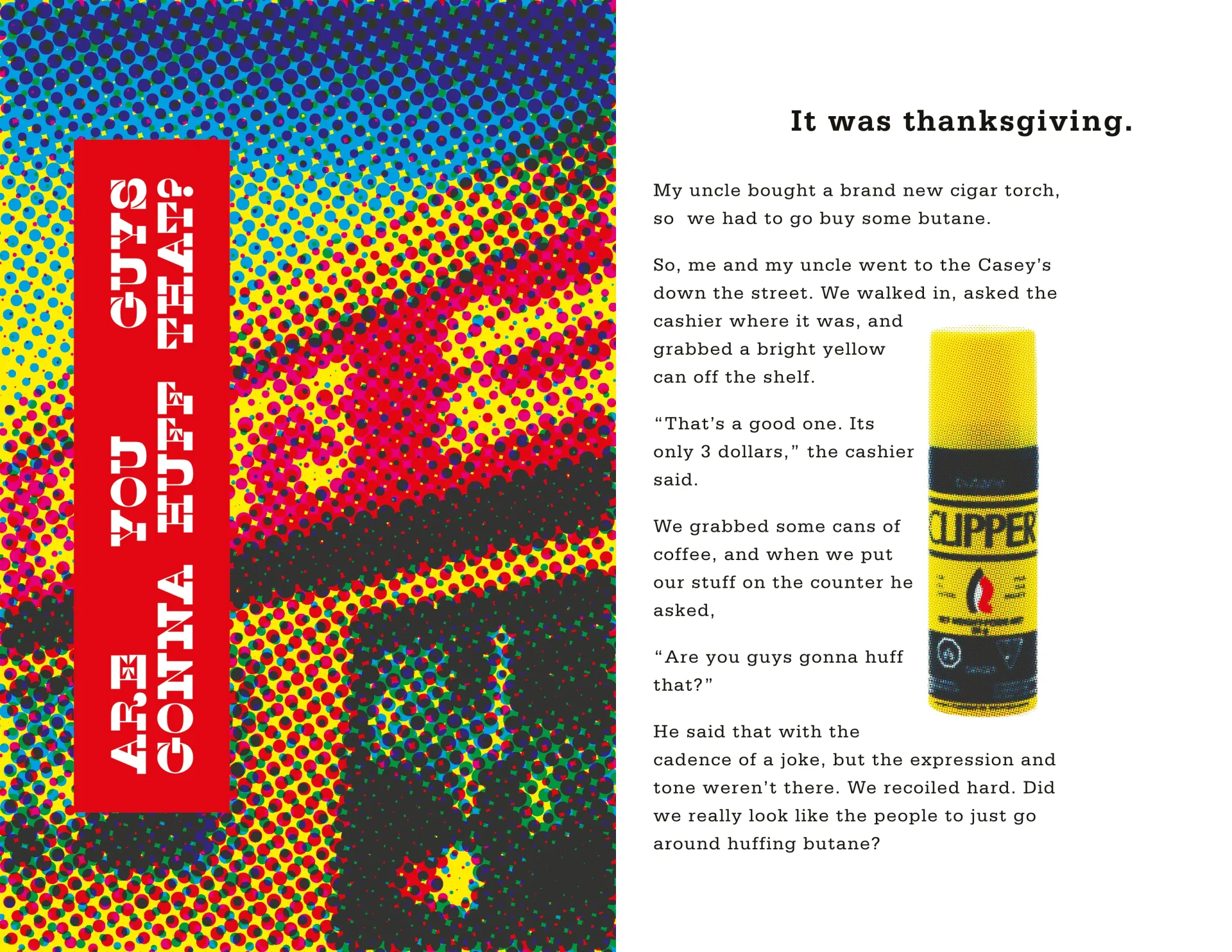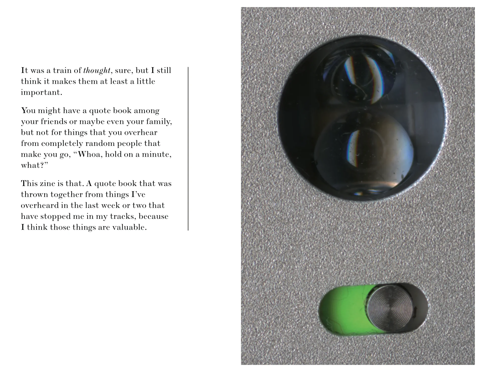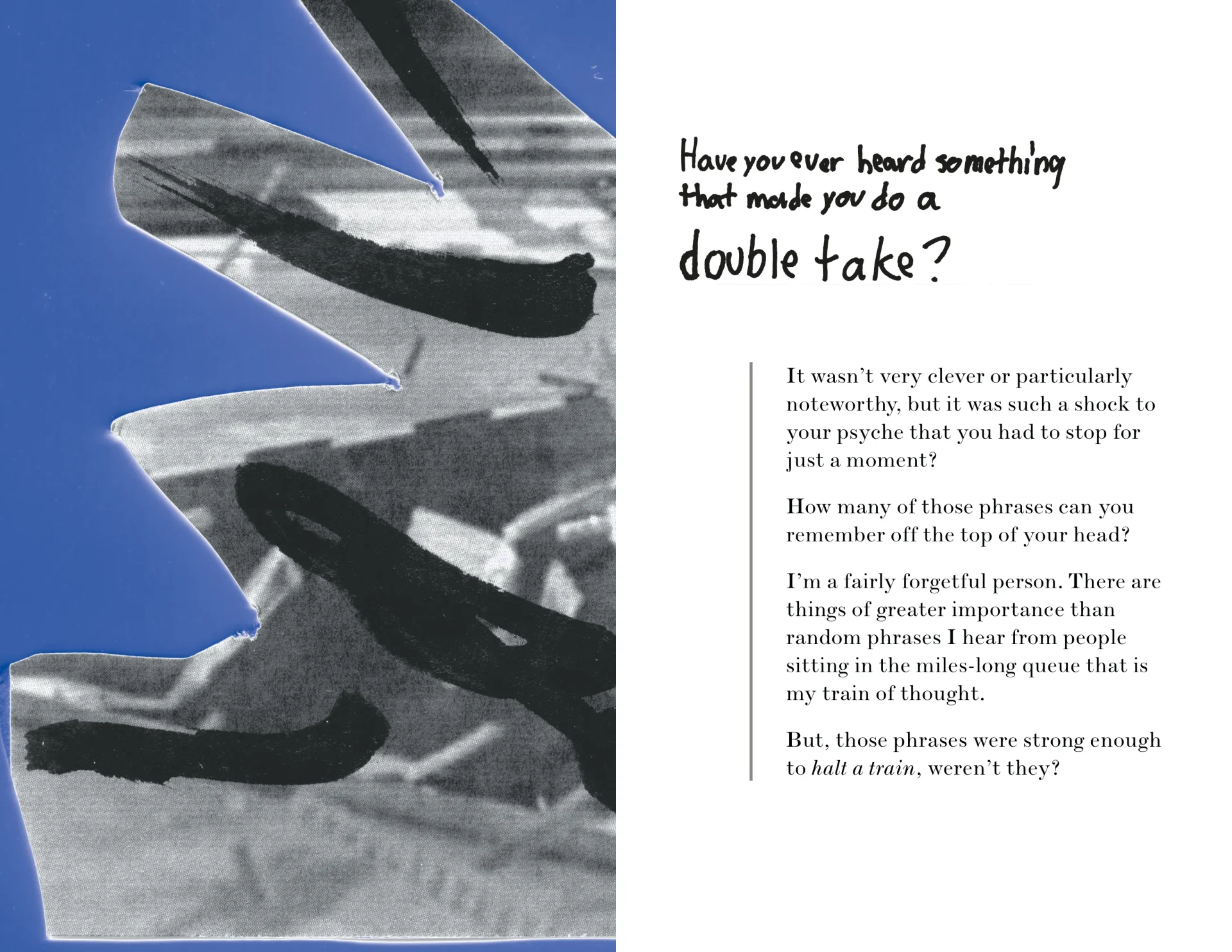 Double Take was a zine made for my Typography I final, and the first zine I have ever made. It is a collection of things you overhear that make you stop what you’re doing and do a double take, as I had been hearing a lot of those sorts of things over the last week, and continued to hear them as I wrote the zine.